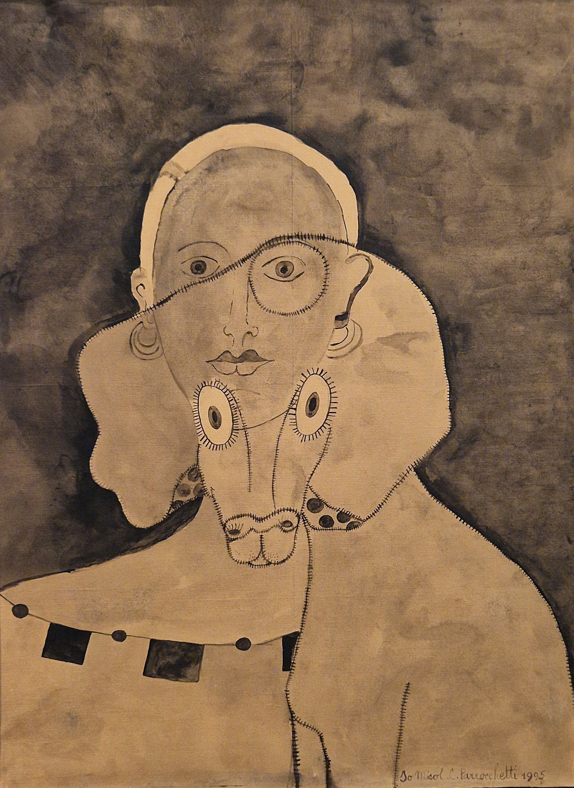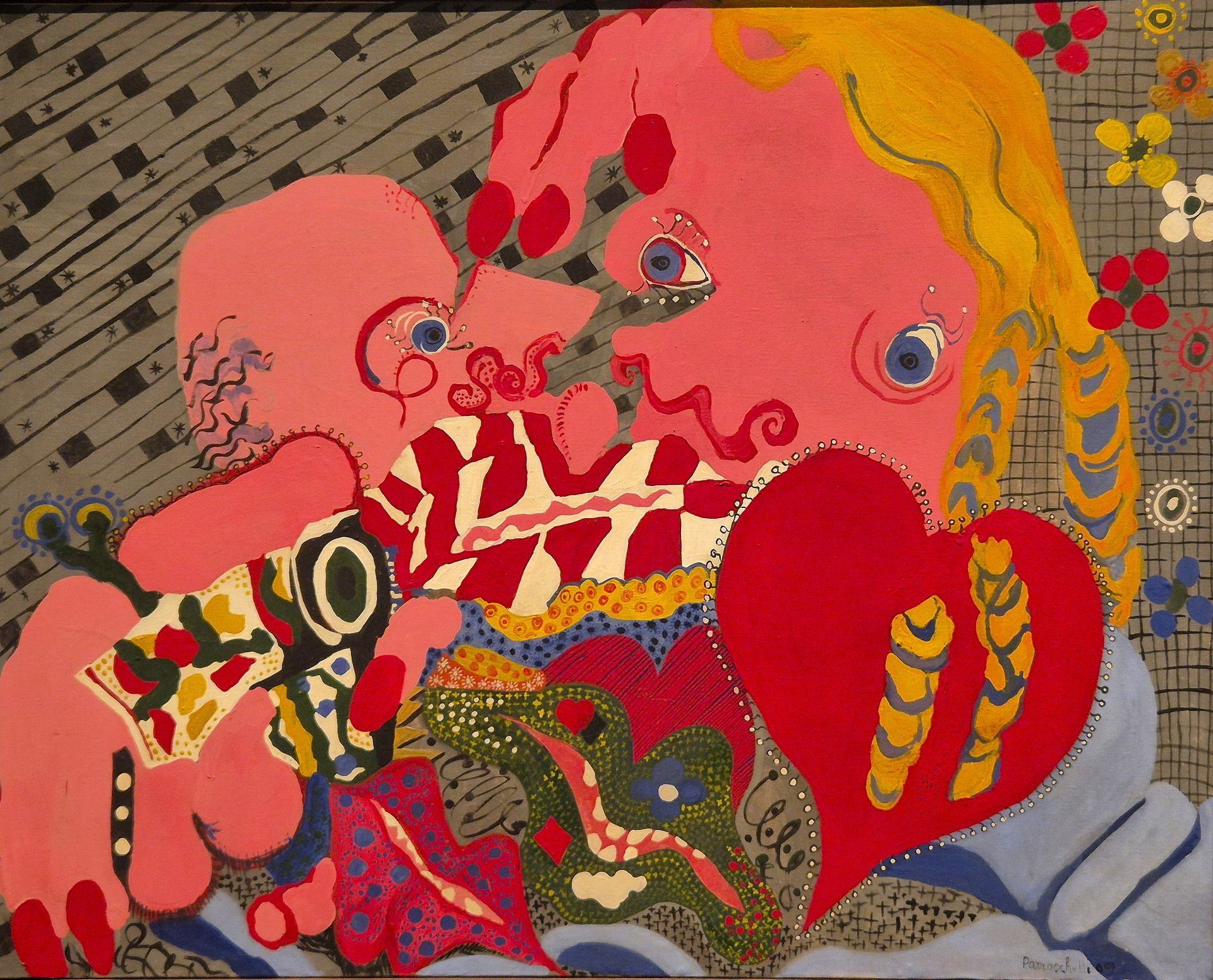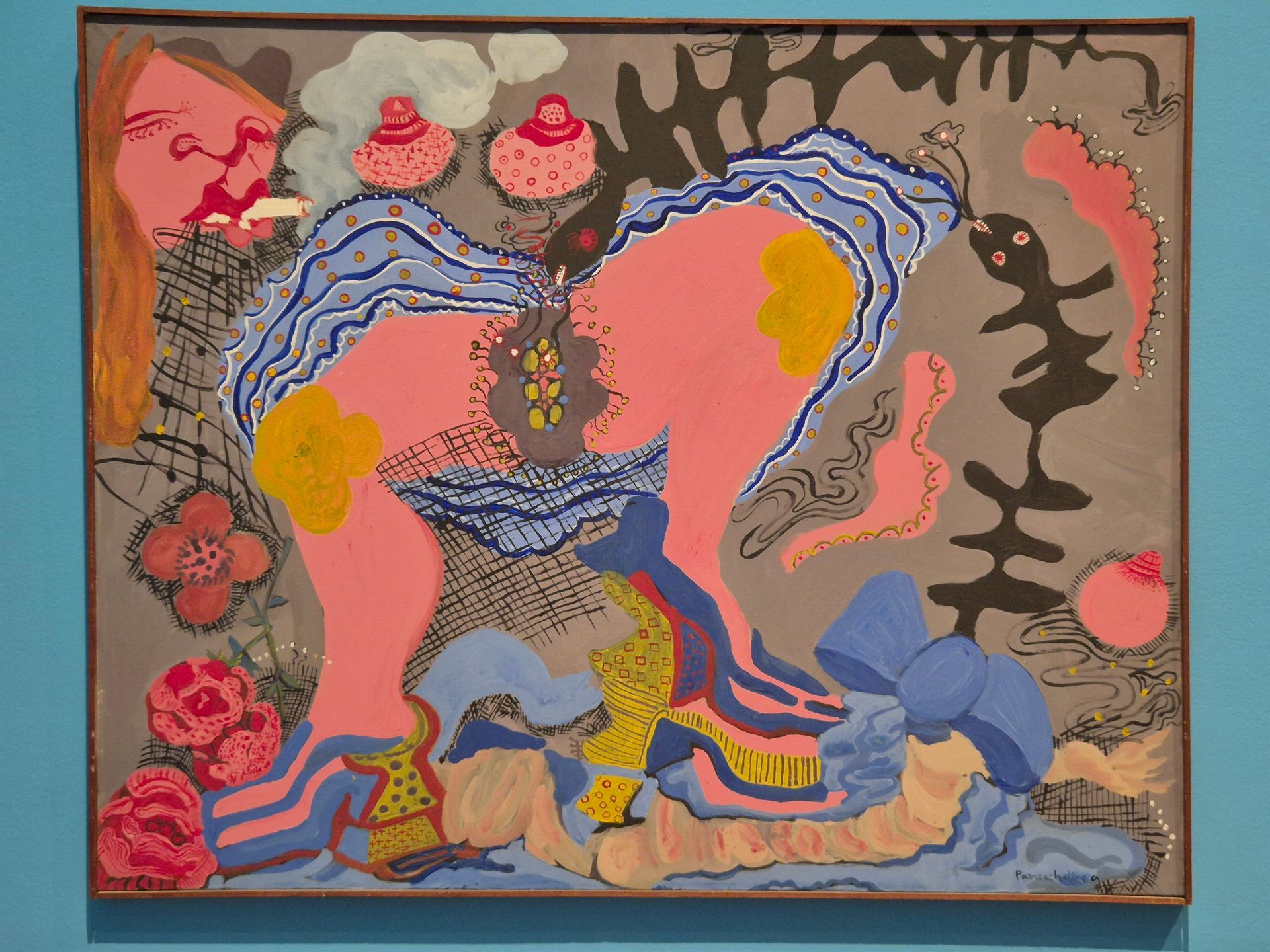Dopo la pittura degli esordi, Parrocchetti inizia a concepire l’arte come un’arma di attacco frontale al perbenismo borghese e alla cultura patriarcale che riduce la donna a merce. Sulle tele compare un immaginario perturbante, caleidoscopico e carnevalesco, in cui mascheroni grotteschi e corpi scomposti si divorano contornati, per contrapposizione, da un’atmosfera giocosa fatta di bocche, merletti, fiocchi, vagine, dolci e fiori. Un universo visivo irriverente si para davanti ai nostri occhi lasciando emergere desideri e istinti nascosti.