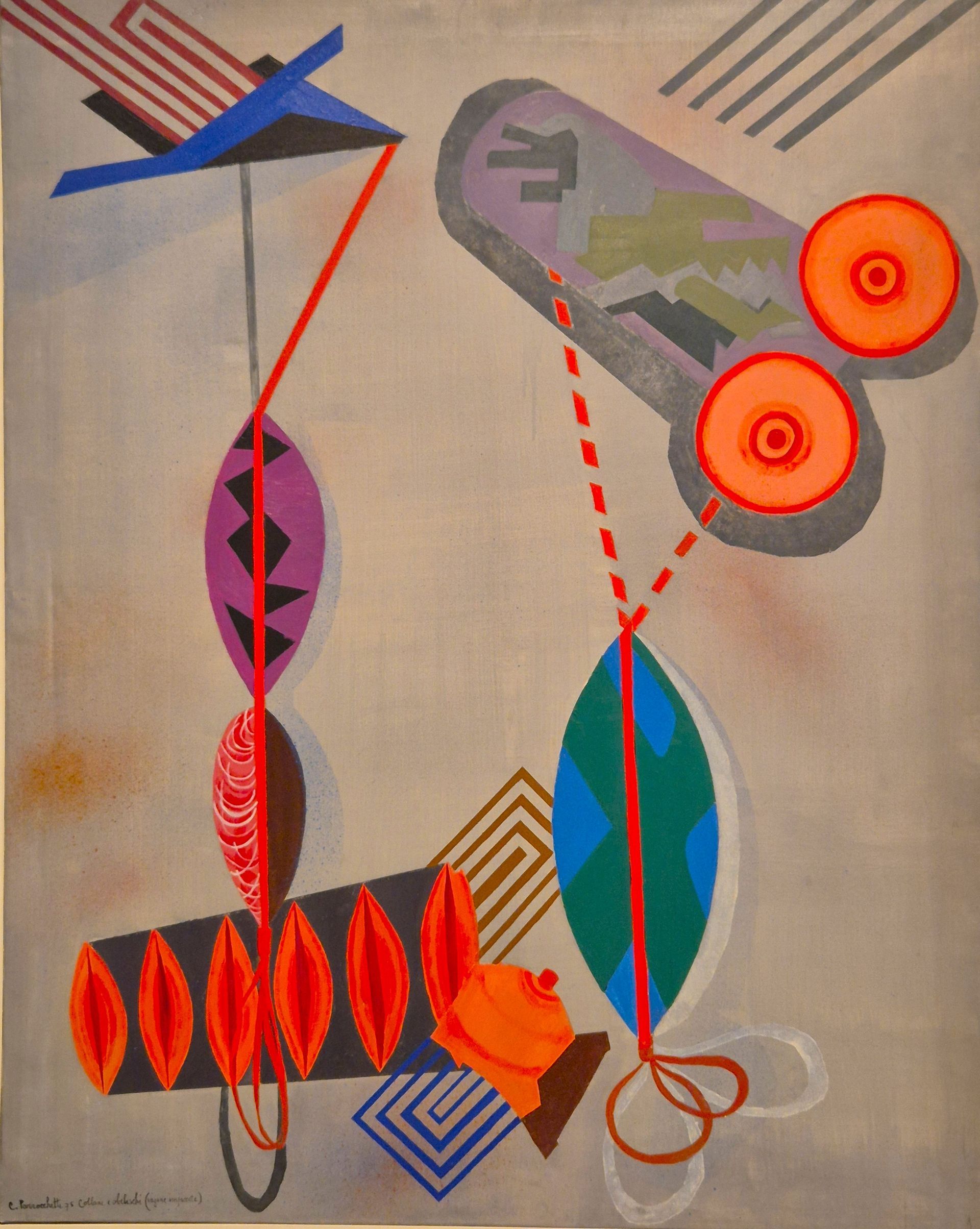 A questo corpus di lavori appartengono anche sculture leggere, fatte di fili, cavi e materiali poveri che richiamano le costruzioni cinetiche di Alexander Calder, ma non sono sospese e leggere, non misurano l’aria e il tempo come quelle dell’artista statunitense, le opere di Clemen Parrocchetti sono concepite come anti-trofei della femminilità tradizionale.