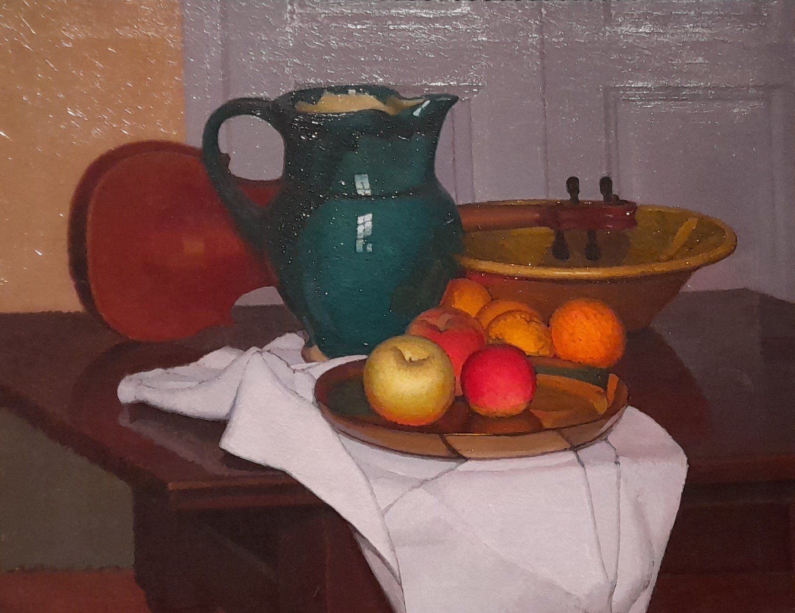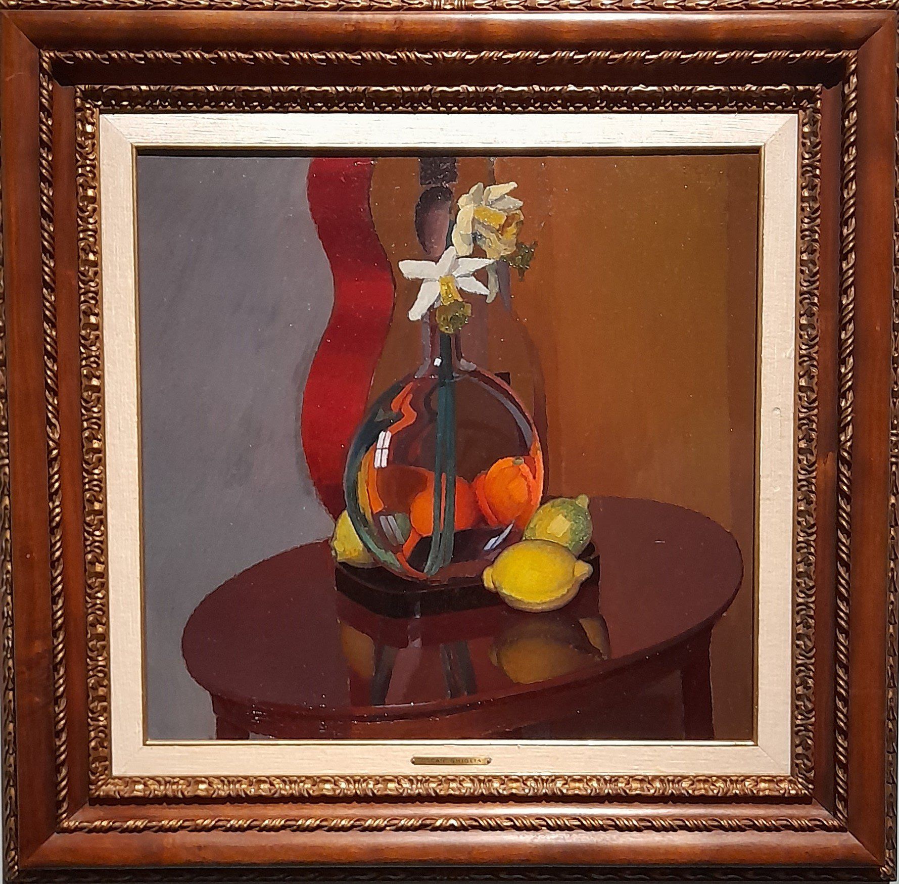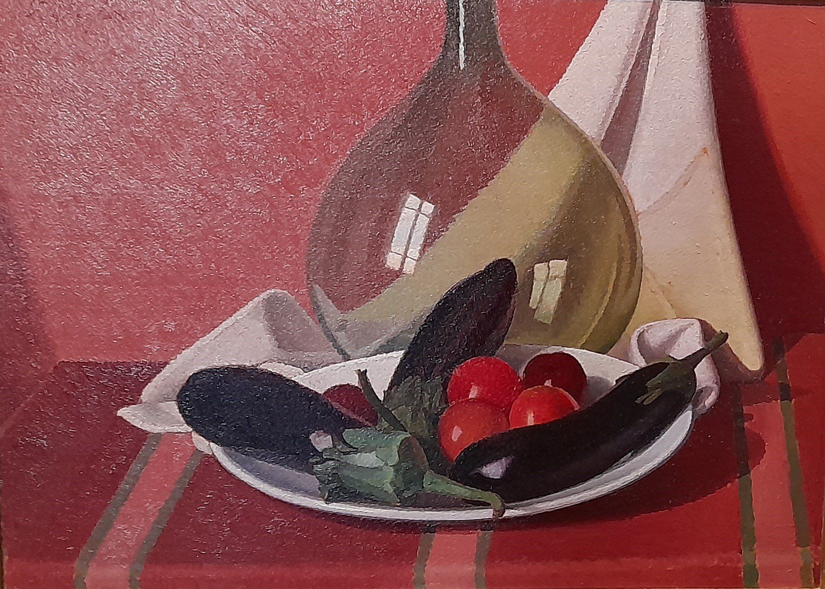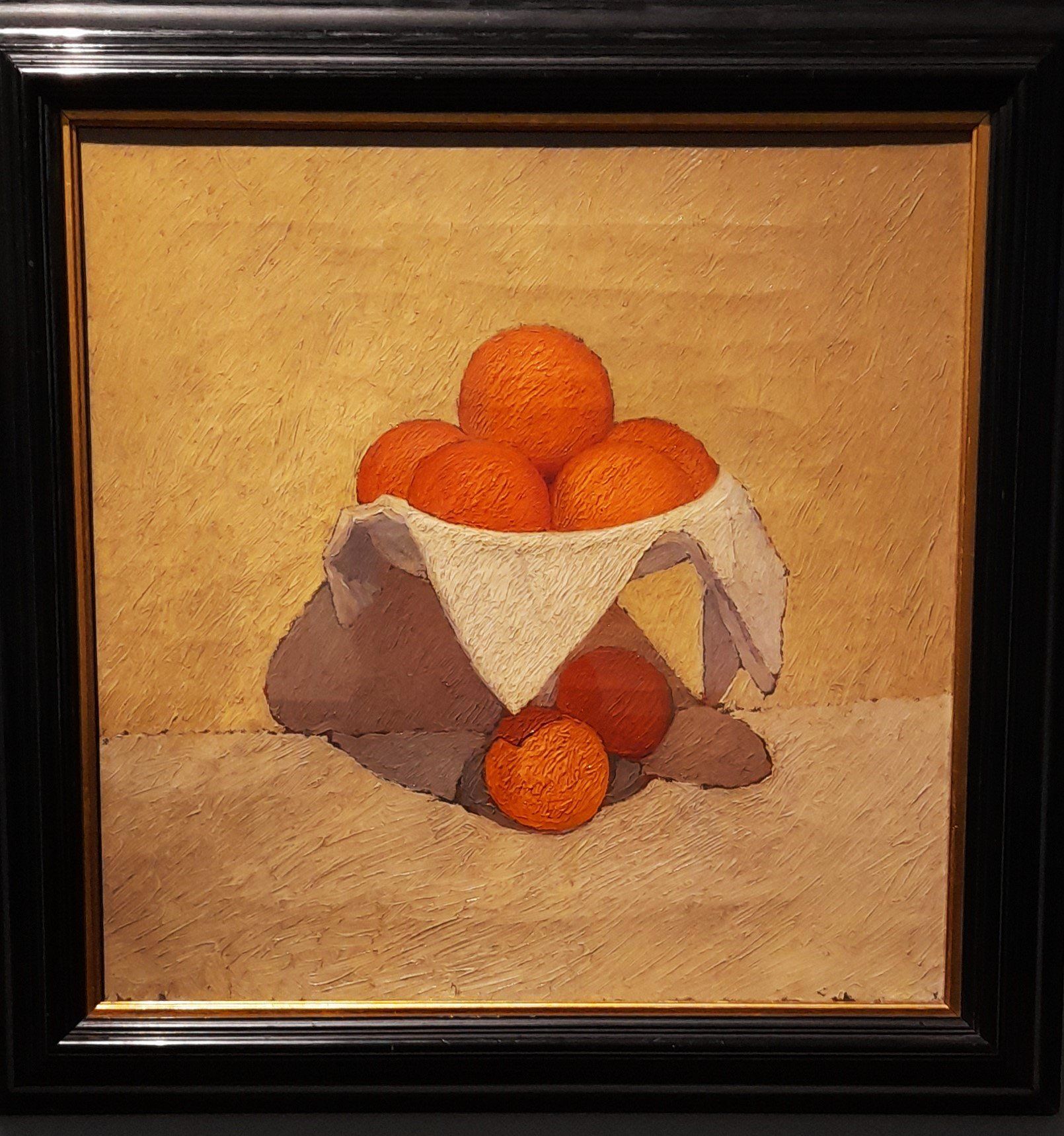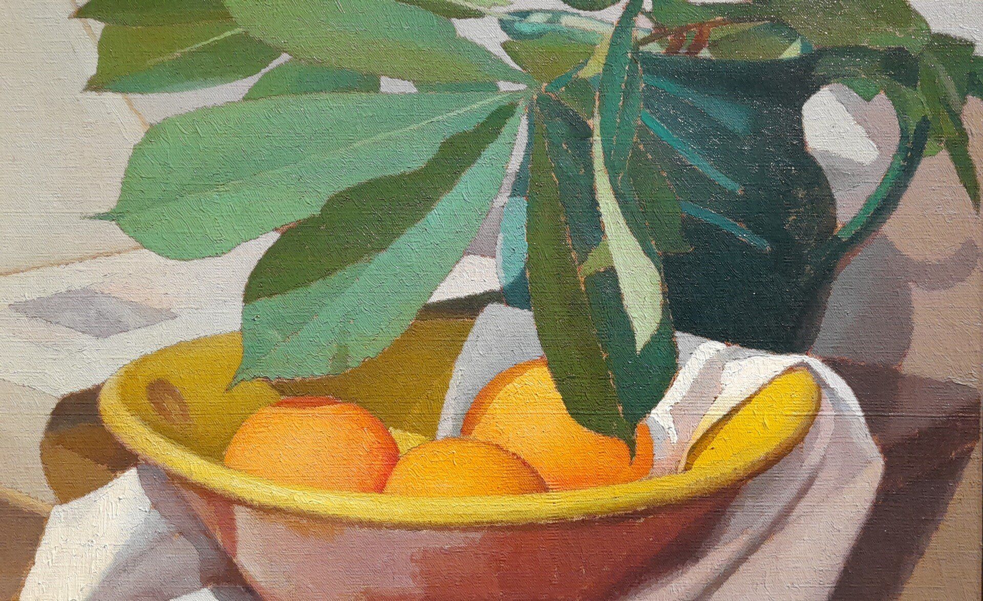 Oscar Ghiglia (1876-1945) è pittore nato e cresciuto a Livorno, trasferitosi a Firenze per seguire l’amico Giovanni Fattori. La sua prevalente toscanità non gli ha impedito di assorbire le influenze artistiche europee, in particolare quelle di Cezanne. In seguito, ha sviluppato una cifra stilistica del tutto personale, culminata nella serie delle nature morte, alla ricerca di forme e colori nitidi e ordinati, allo stesso tempo enigmatici e simbolici, una sorta di “poesia muta” immobile ma anche fremente di vita.