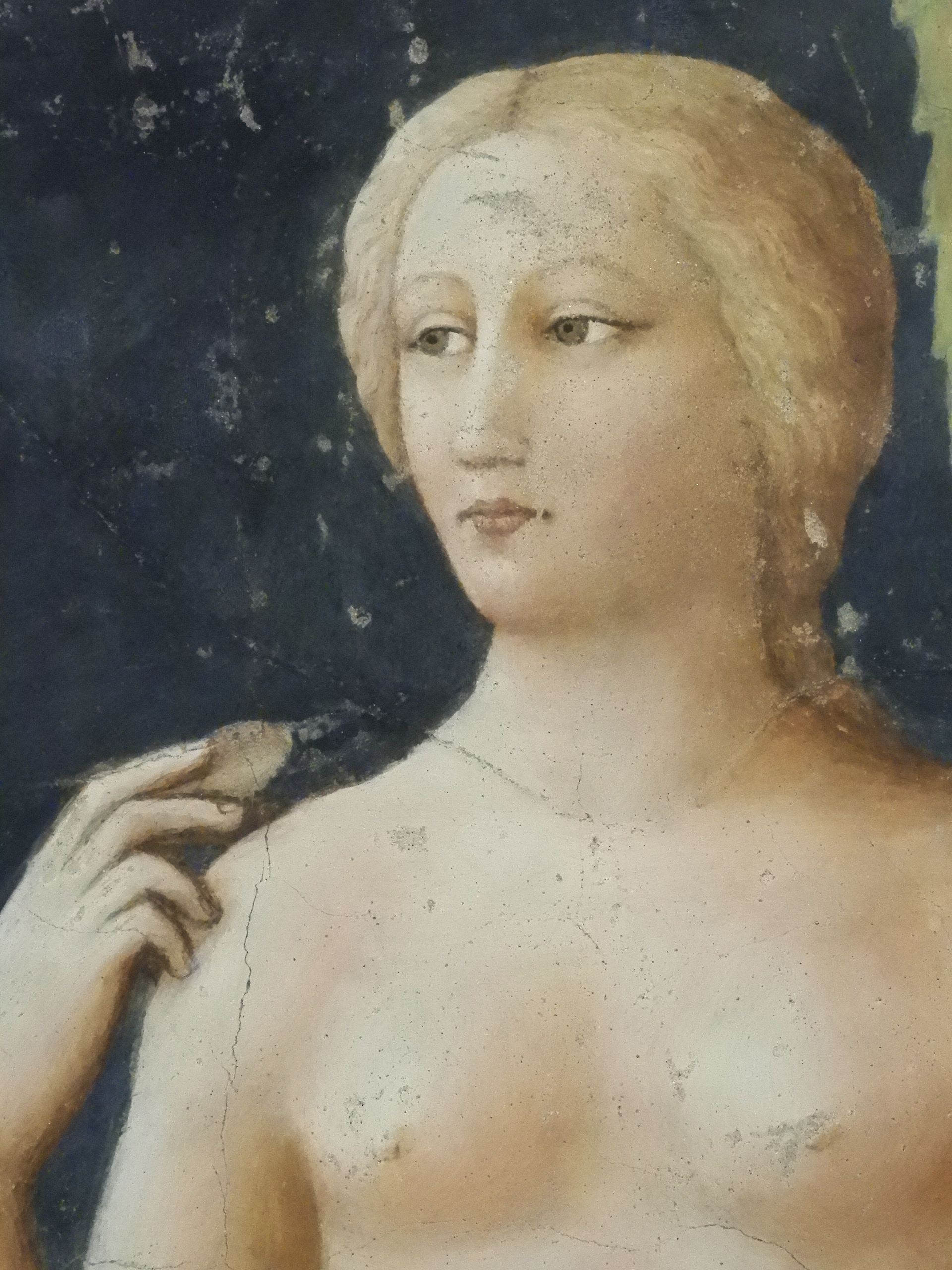 Molto agevole è il confronto, celebrato in tutti i libri di storia dell’arte, tra le due scene raffiguranti Adamo ed Eva, una dipinta da Masolino e l’altra da Masaccio. La Tentazione è più rovinata rispetto alla Cacciata e quindi il confronto forse non può essere completo e sincero fino in fondo, ma è sufficiente osservare come vengono raffigurati Adamo ed Eva per comprendere l’orizzonte di ciascuno dei due artisti. Quelle raffigurate da Masolino sono figure composte ed eleganti, la morbidezza della loro carne è resa dal pittore con un leggero chiaroscuro, mentre la loro fierezza è espressa attraverso gli sguardi orgogliosi, che si possono ben notare grazie alla vicinanza con l’affresco. Nella Cacciata del Masaccio i corpi trasmettono la vergogna e il dolore provati per mezzo dei gesti e delle espressioni, soprattutto nel volto di Eva, ma pure in quello di Adamo, anche se si copre il volto con le mani. Masaccio conferisce alle rappresentazioni dei suoi uomini e delle sue donne una grande personalità, fatta di forti emozioni e di specchiati sentimenti.