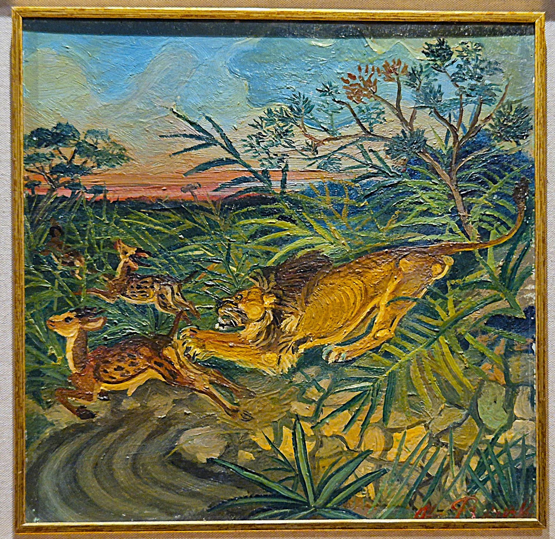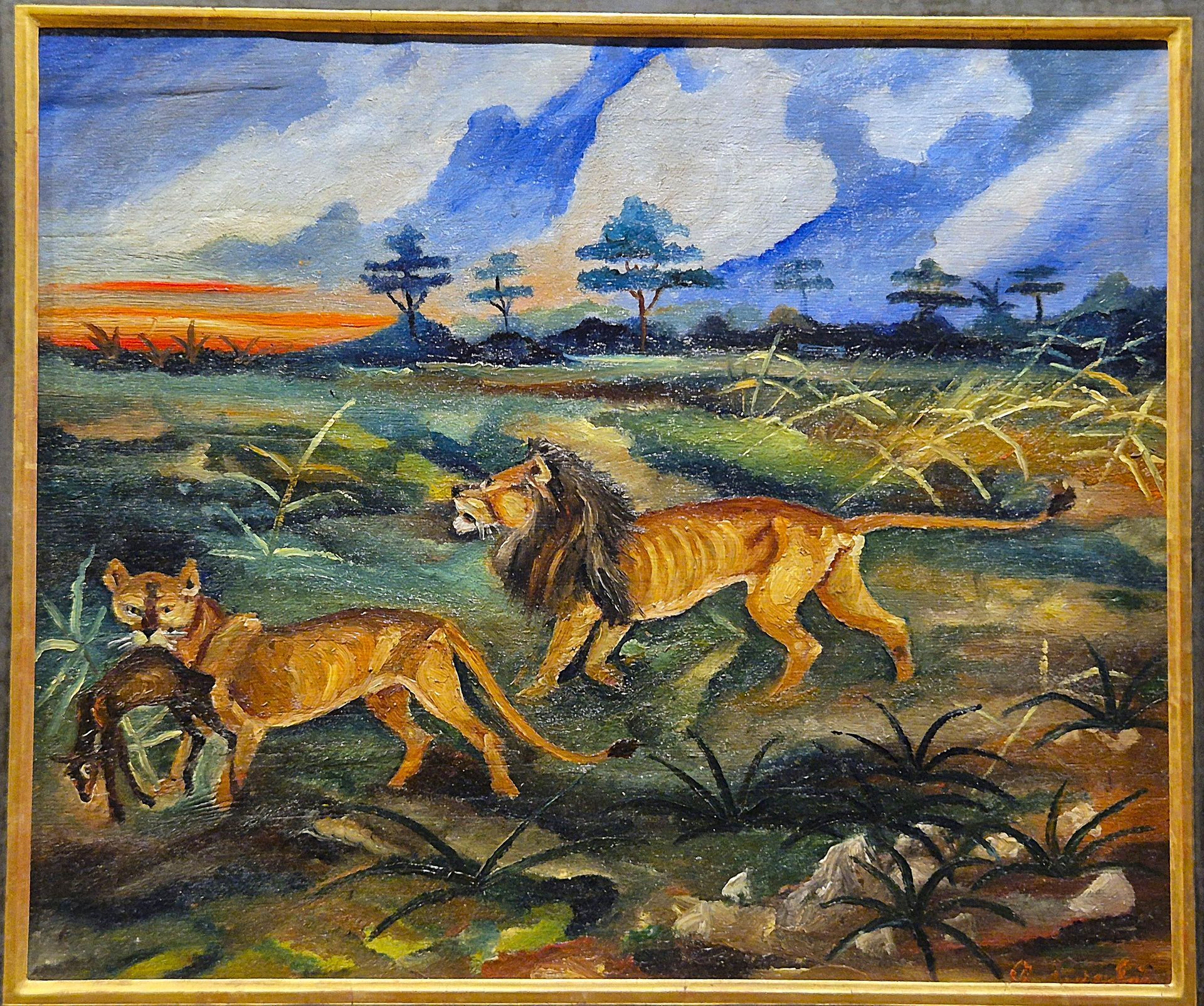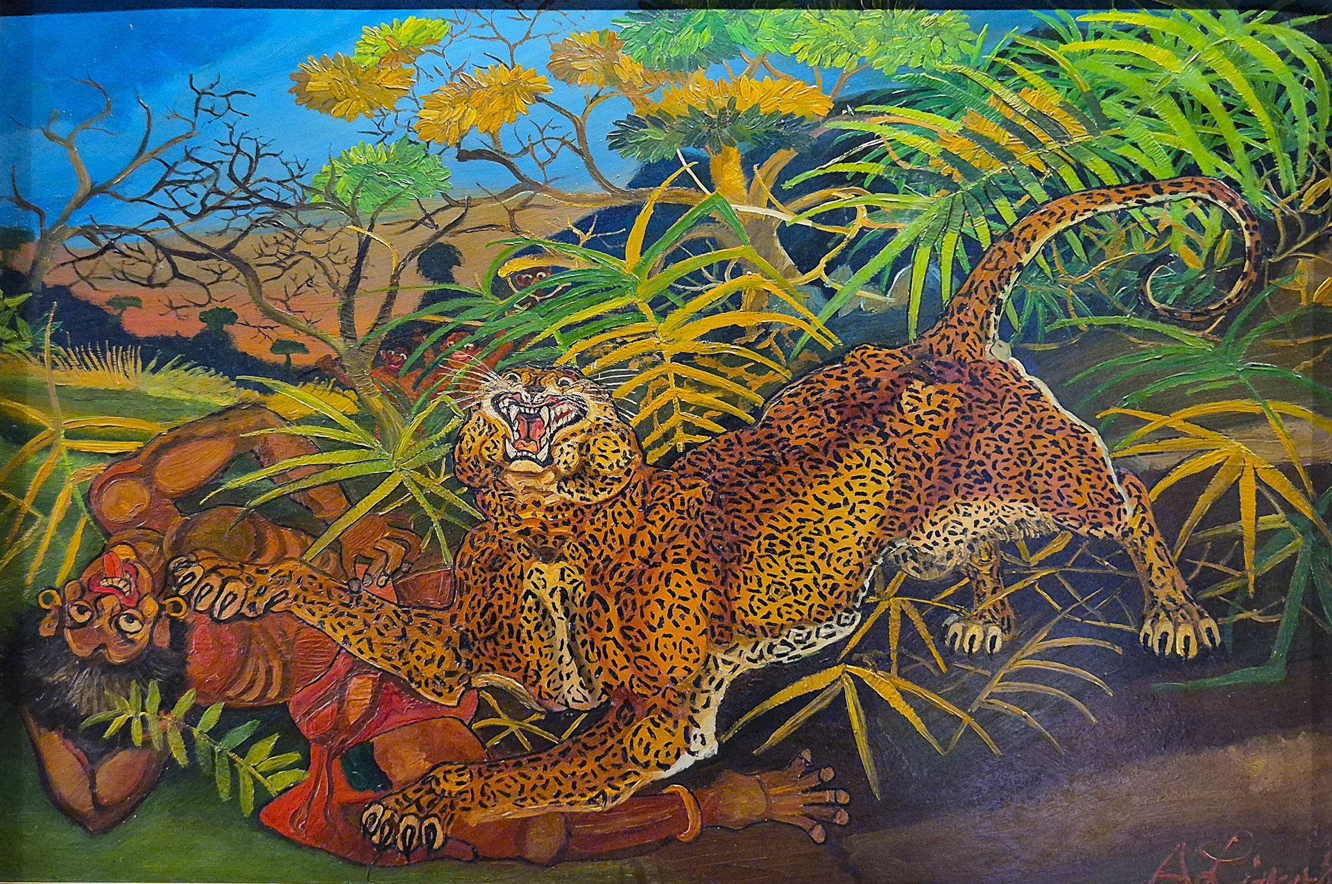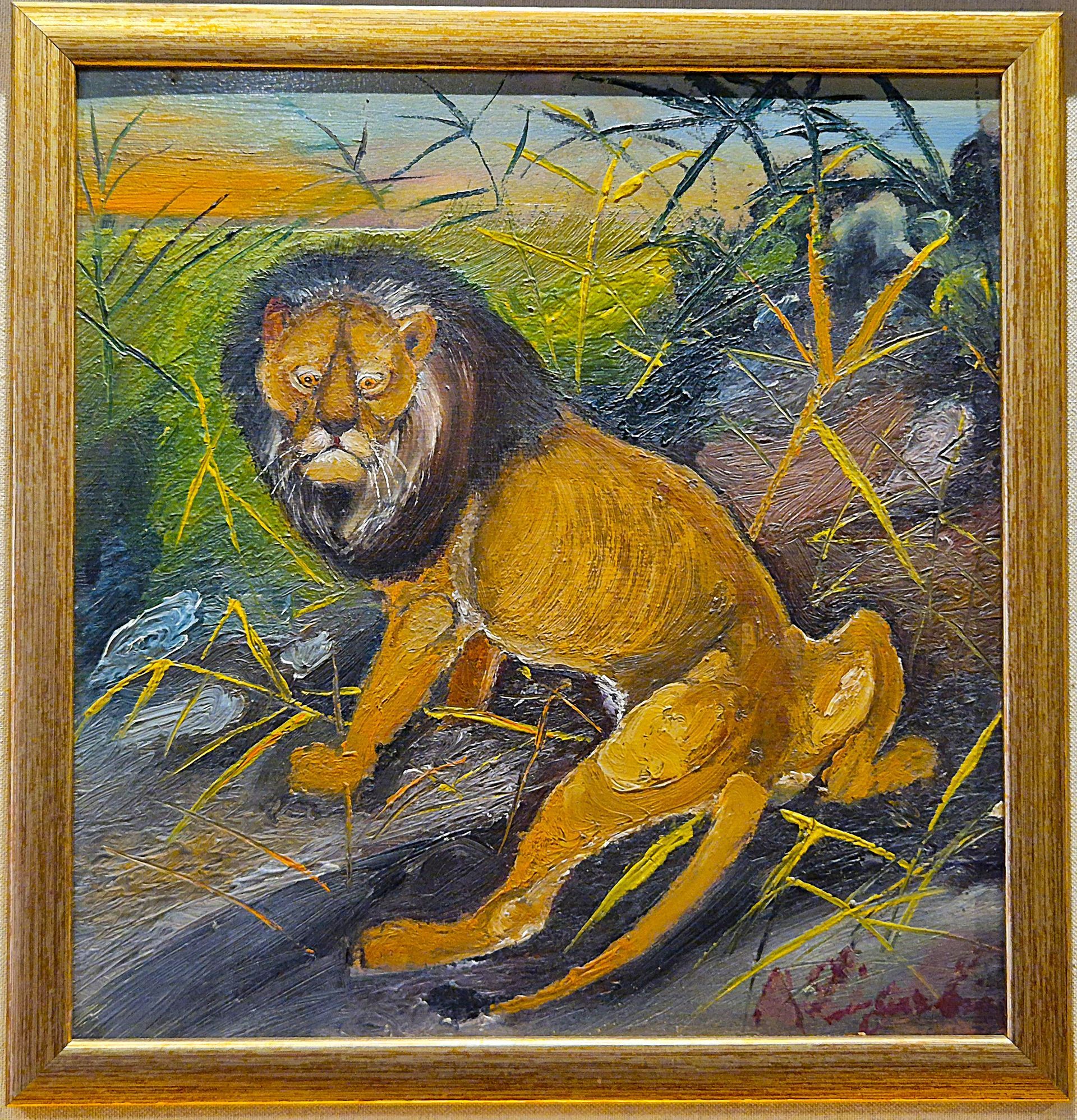 Ligabue cattura l'essenza della natura selvaggia come specchio del proprio mondo interiore, la forza istintiva, la solitudine, il bisogno di affermarsi contro tutto. Le pennellate drammatiche, colori intensi, trasformano la scena in un dramma primordiale dove la vita e la morte convivono in un equilibrio fragile, potente. L'artista non descrive un episodio naturale, ma una visione simbolica, il Leone è l'emblema dell'energia vitale che divora e salva, un alterego che incarna il tormento e la grandezza dell'esistenza in questo scontro.