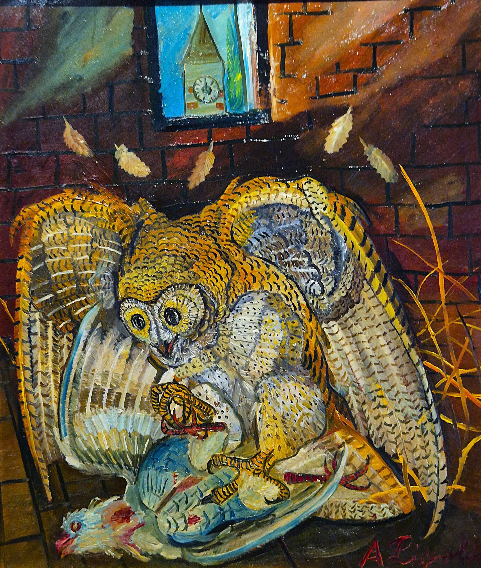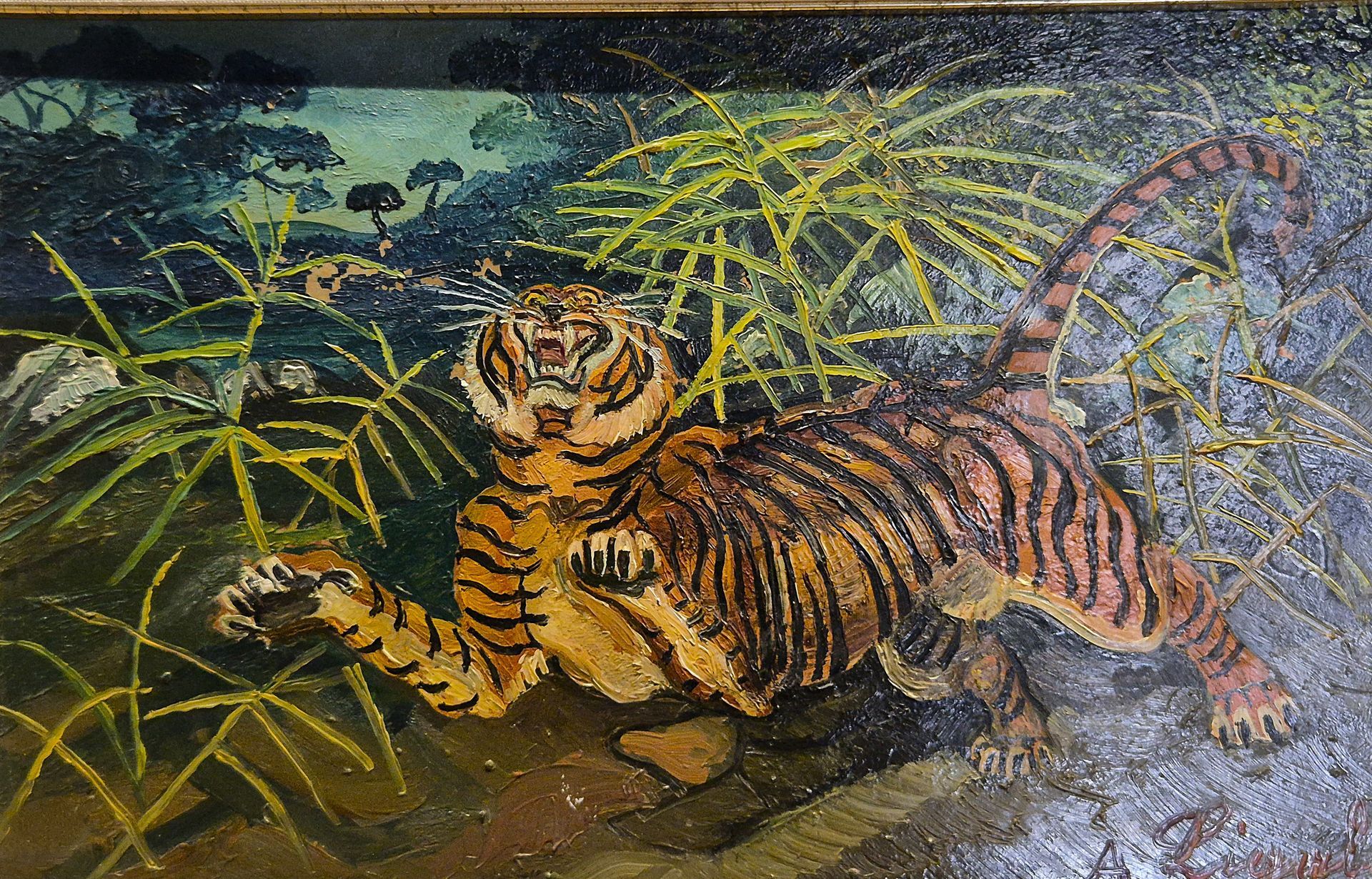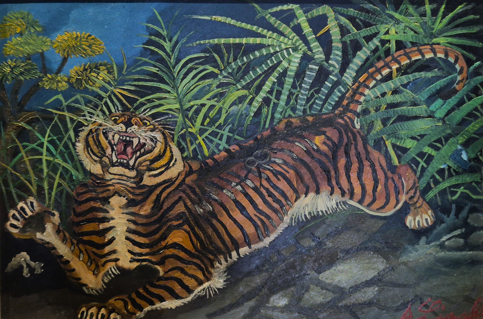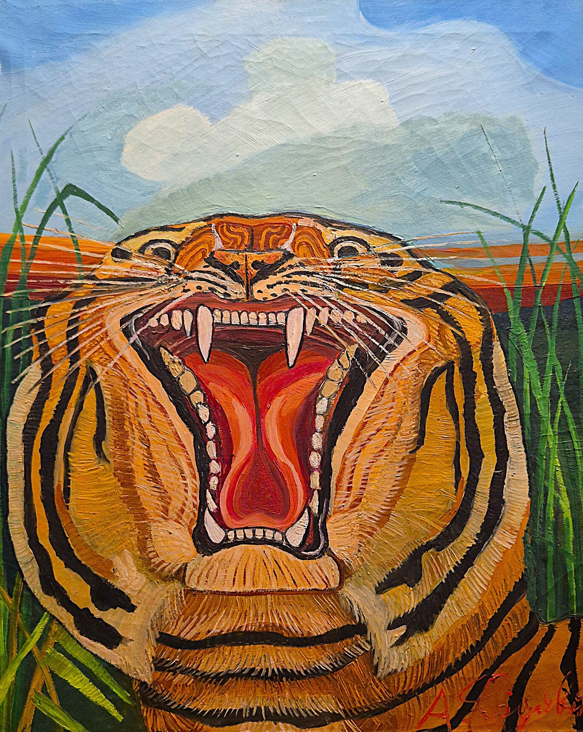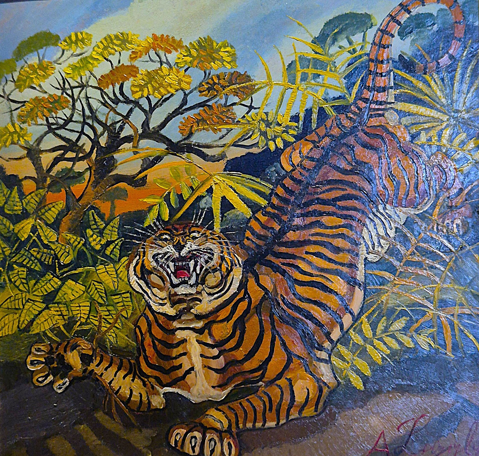 Quest'opera condensa tutta la forza istintiva e drammatica del suo universo animale. Il volto della tigre ritratto in primo piano esplode in un vortice di colori accesi e pennellate feroci. L'Arancio, il nero, il bianco diventano materia viva, carne e furia. Lo sguardo dell'animale, insieme minaccioso e sofferente, riflette il tormento dell'artista.