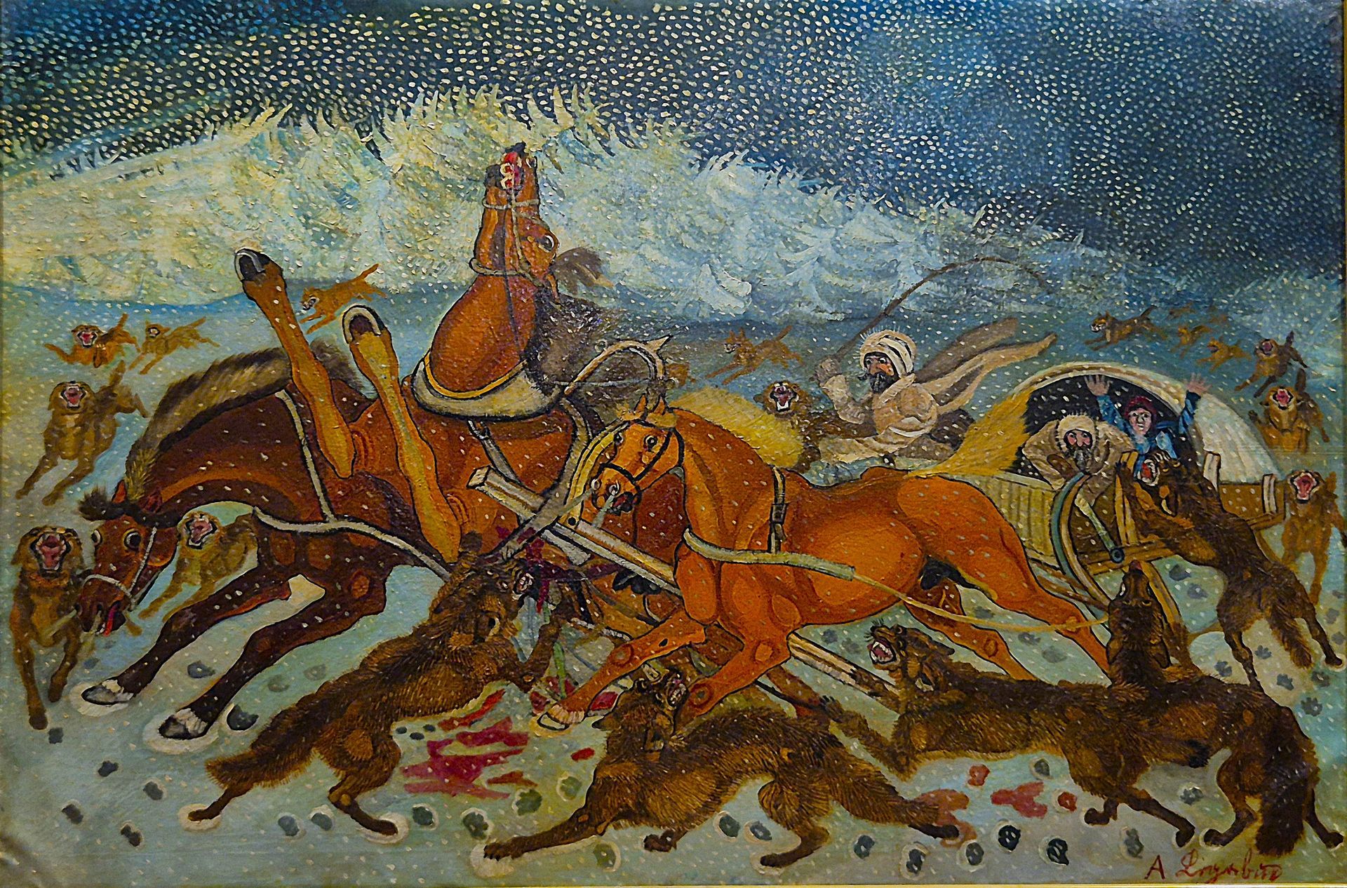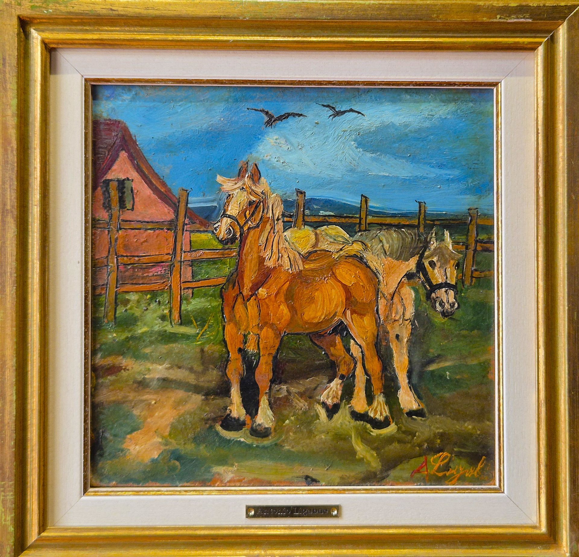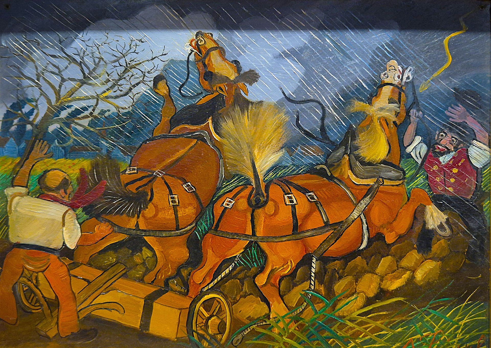 L’arrivo dei postiglioni diventa per Ligabue un evento epico: il fragore degli zoccoli, il vento, la tensione dei corpi animano un paesaggio che vibra di energia nella concitazione del movimento. In un racconto di potenza e libertà, le pennellate corpose e i colori accesi trasmettono il senso di urgenza e di vita che attraversa tutta la sua opera, è un omaggio al mondo rurale, ma anche la forza primordiale dell'uomo e degli animali, uniti nello stesso respiro selvaggio della natura.