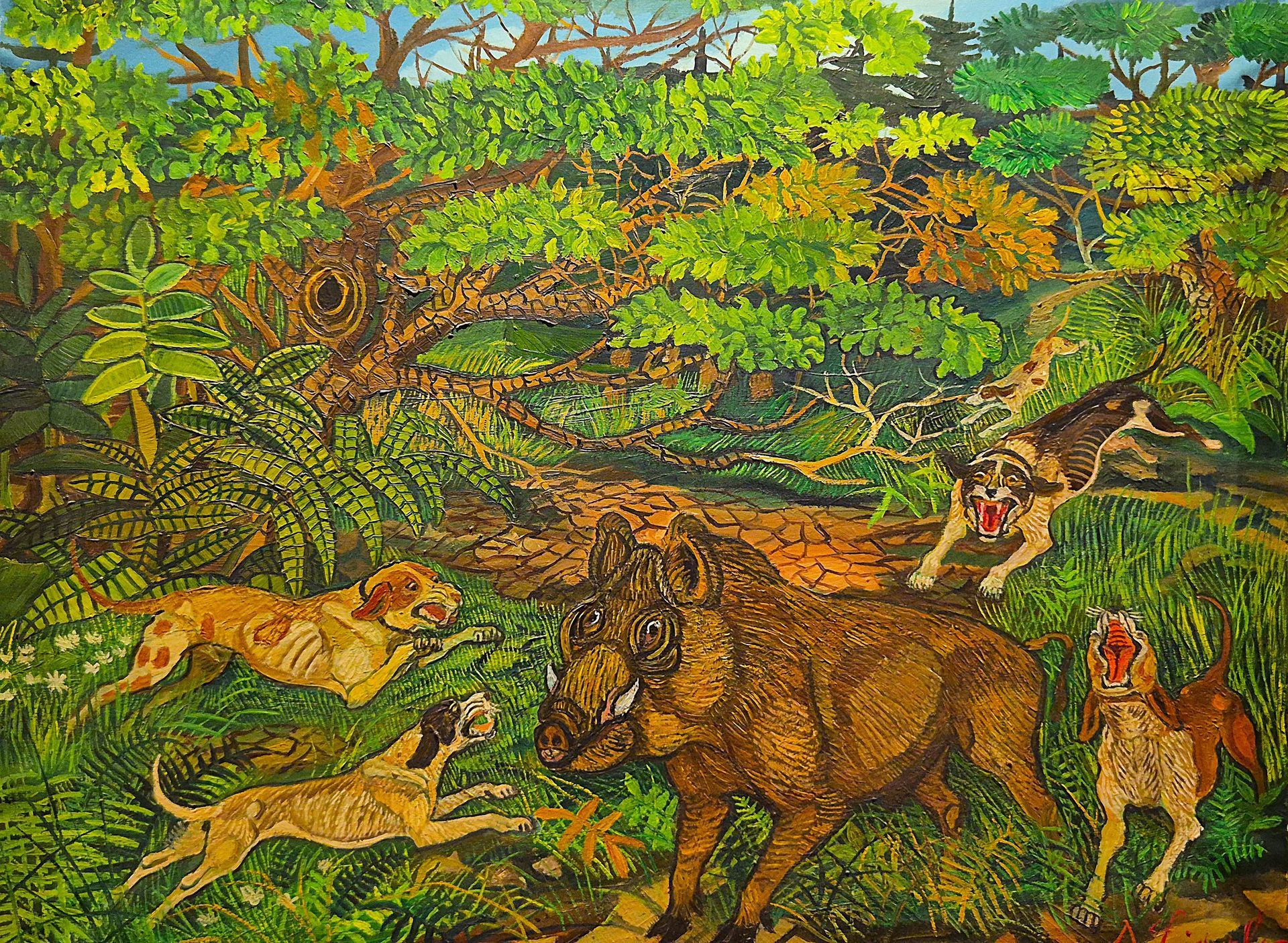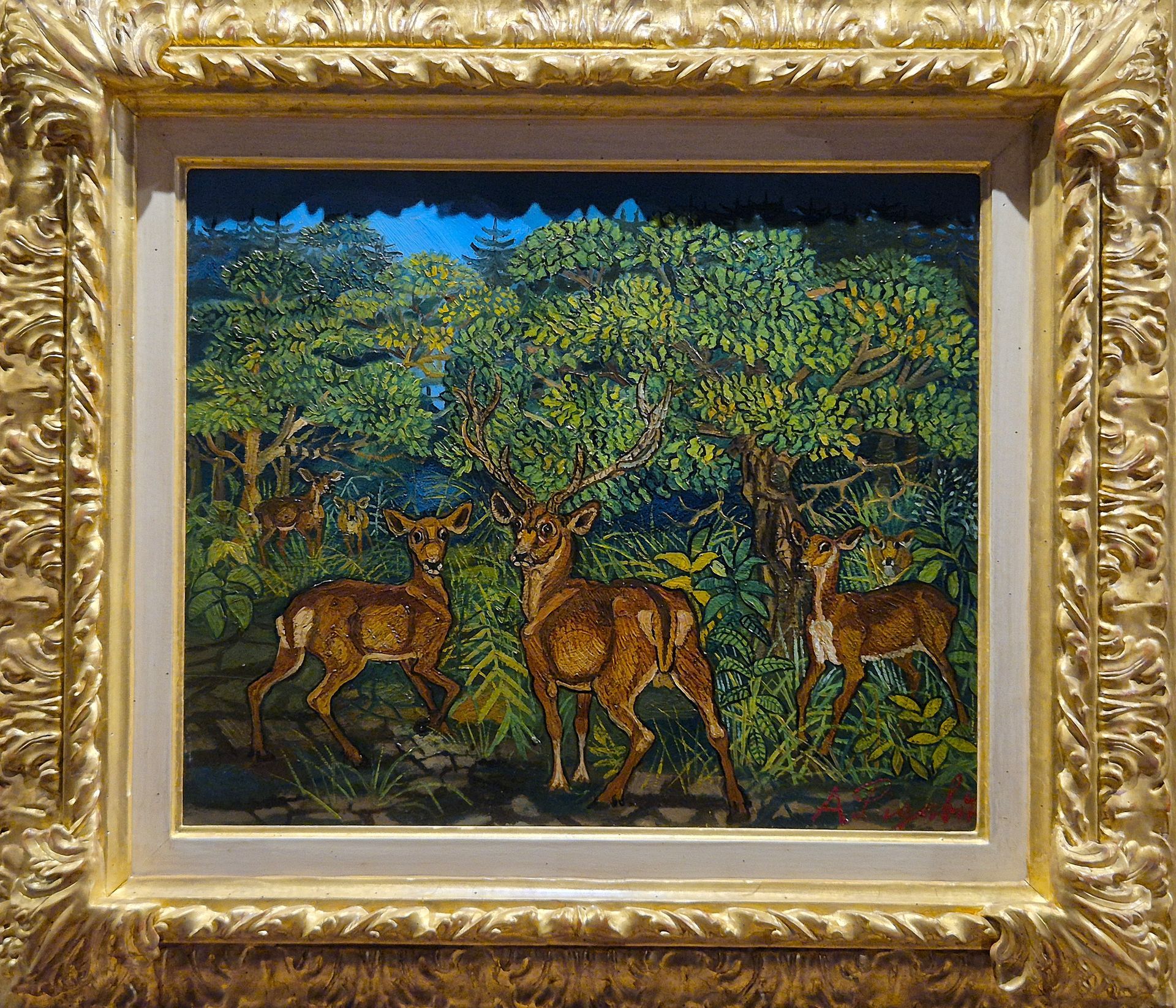 Un gruppo di cervi si muove tra i boschi, immerso in una luce che filtra tra i rami, come un respiro della natura. Ligabue osserva gli animali con una partecipazione emotiva profonda, trasformando la scena in un ritratto collettivo di grazia e di inquietudine. Le corna si intrecciano come arabeschi, i corpi sembrano vibrare di energia, pronti a fuggire o a sfidarsi. Attraverso pennellate dense e colori terrosi, l'artista restituisce il ritmo vitale del mondo selvaggio, ma anche la sua fragilità. Nei cervi eleganti e vulnerabili si riflette la sua stessa tensione interiore, la paura dell'isolamento, la bellezza di una natura che accoglie e minaccia al tempo stesso. È un canto della vita, dove la forza si misura con la paura, e la solitudine si fa poesia.