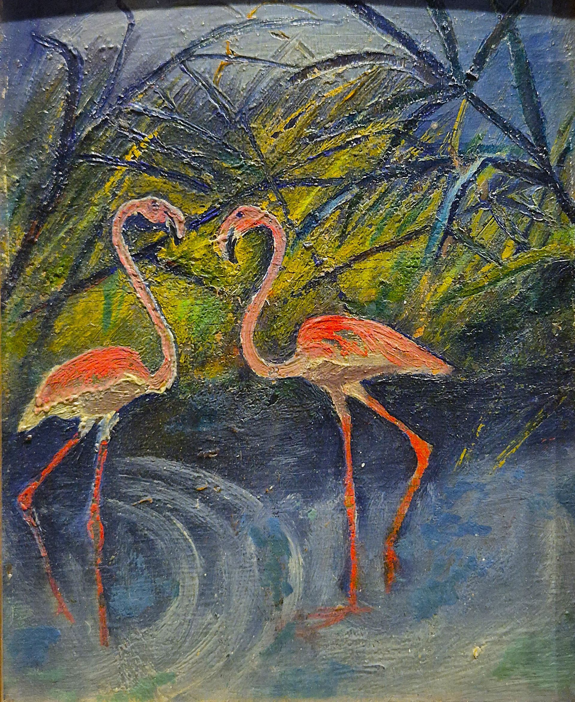Una coppia di fenicotteri si raccoglie in riva all'acqua. Ligabue trasforma la scena naturale in un sogno cromatico, dove il rosa intenso delle piume si fonde con i toni verdi e turchesi del paesaggio. Eleganti e inquieti, sembrano sul punto di spiccare il volo, di dissolversi. Con pennellate dense, l'artista esprime un senso di meraviglia e di inquietudine. Il desiderio di un mondo libero e chiaro come quello che immagina sulla tela. Nei fenicotteri, sospesi tra grazia e malinconia, si riflette la sua ricerca di bellezza, di riscatto, di libertà.