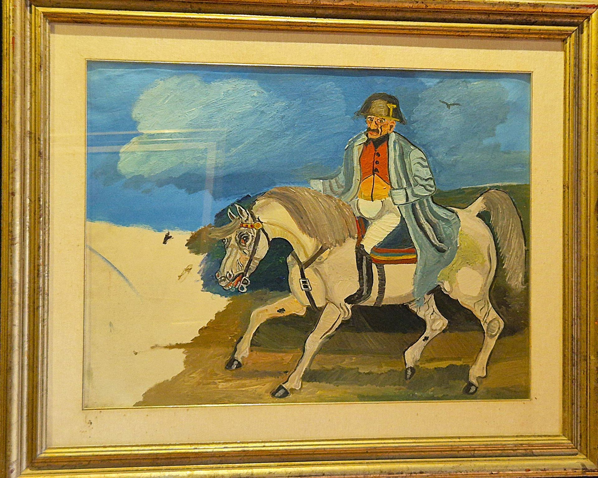 "Napoleone a cavallo" è un olio su tela, appartenente alla fase finale della produzione di Ligabue. Quest'opera, rimasta incompiuta, rappresenta un’inconsueta incursione dell’artista nel ritratto storico. Raffigura il generale francese con il volto dell'artista stesso, riflettendo un desiderio di auto-celebrazione e immedesimazione in una figura storica di potere.